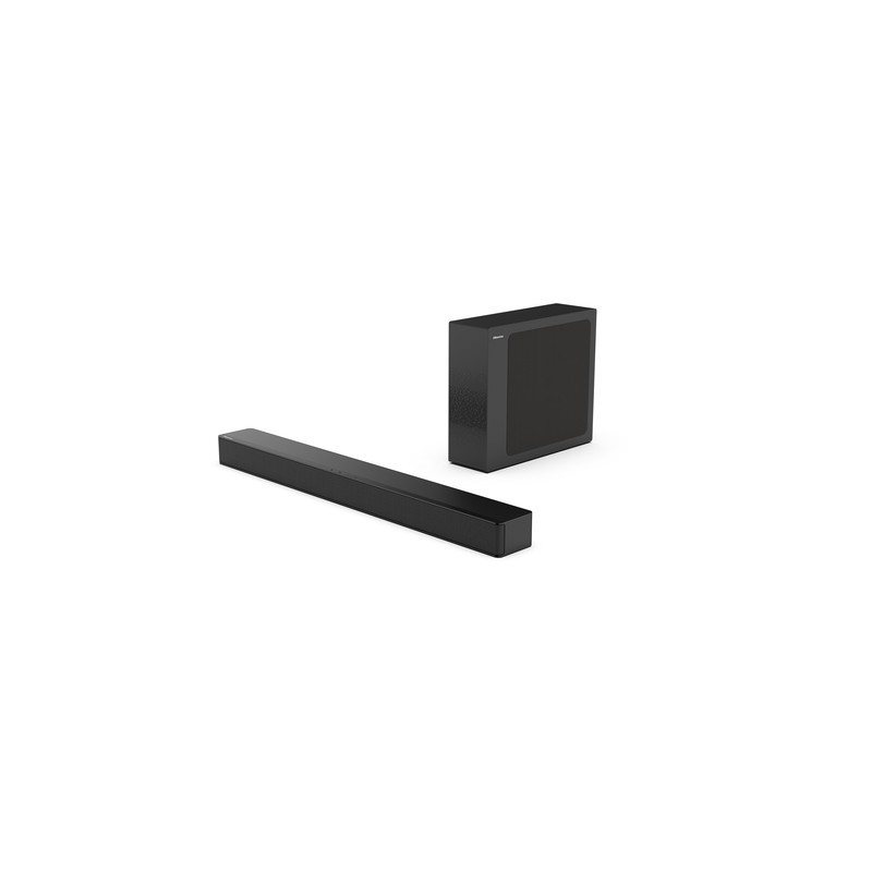 Hisense HS2100. Canales de salida de audio: 2.1 canales, Potencia estimada RMS: 240 W, Decodificadores incorporados: DTS Virtual:X, Dolby Digital, Dolby Digital Plus. Potencia de la barra de sonido del altavoz RMS: 120 W, Divisor de frecuencia: 20000 Hz, Diámetro del woofer (imperial): 13,3 cm (5.25"). Tipo de subwoofer: Altavoz de subgraves (subwoofer) activo, Conectividad del altavoz de subgraves (subwoofer): Inalámbrico, Potencia RMS de subwoofer: 120 W. Color del producto: Negro, Formatos de audio soportados: MP3, WAV, WMA, Control de volumen: Botones. Tecnología de conectividad: Inalámbrico y alámbrico