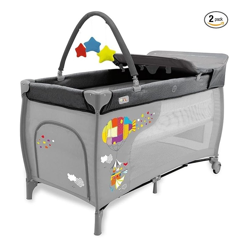 Asalvo Cuna de Viaje 4 en 1 para Bebé con Doble Altura, Arco de Juegos, Plegado Compacto, Base Acolchada y Bolsa de Transporte Mix Plus Zeppelin Gris - -Km.0-