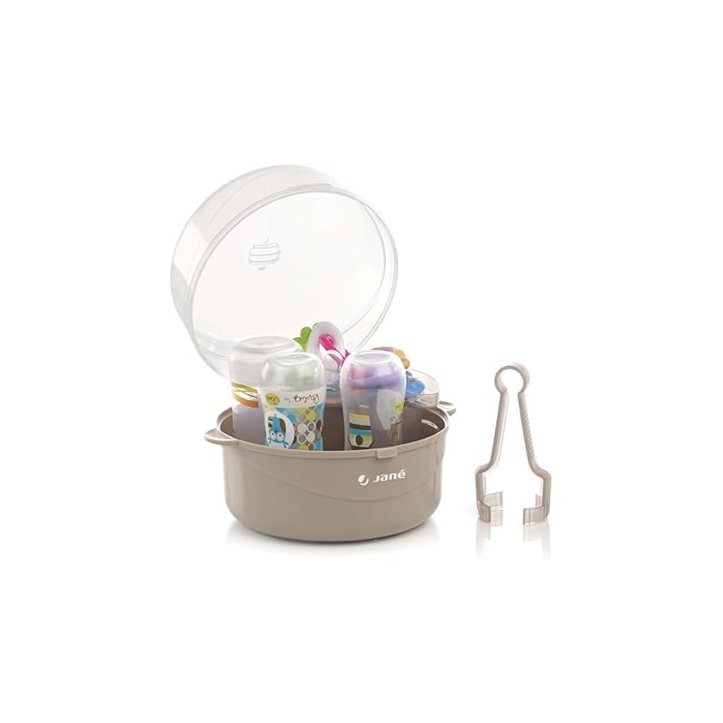 Jané Esterilizador para Microondas, con Cesta para Tetinas y Pequeños Accesorios, Capacidad 6 Biberones, Gris, 17 x 19 x 19 cm - -Km.0-