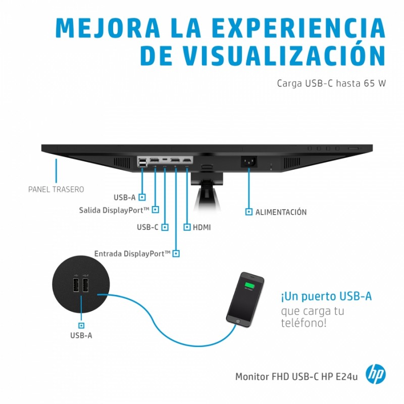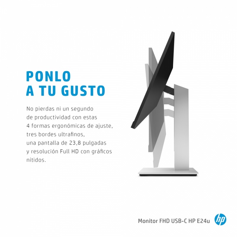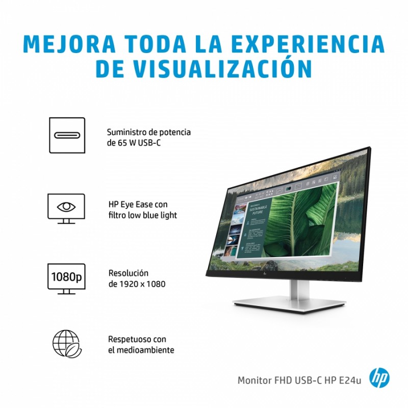 Mejora tu experiencia visual y cuenta con una fuente de alimentación para tu PC Disfruta de una experiencia visual mejorada y saca todo el partido a tu espacio de escritorio cargando tu PC con un solo cable USB-C® directamente desde tu monitor. Trabaja con comodidad durante tu jornada con el monitor HP E24u G4 FHD USB-C, que ofrece una ergonomía optimizada, HP Eye Ease y resolución Full HD. Facilita el trabajo a tu equipo de IT con gestión remota[1].