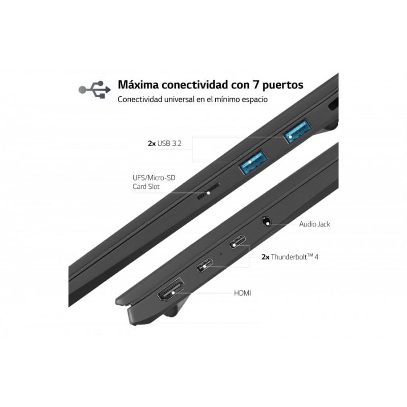 Conectividad universal en tan solo 17,8mm de grosor (2 x USB 3.2, 2 x USB Tipo C con Thunderbolt 4 integrado que permite carga ultrarrápida, 1 x HDMI, entrada de auriculares y ranura para tarjetas UFS/Micro-SD 3.0).