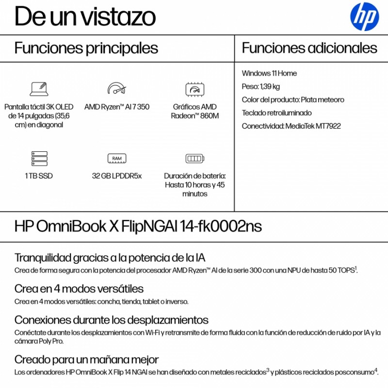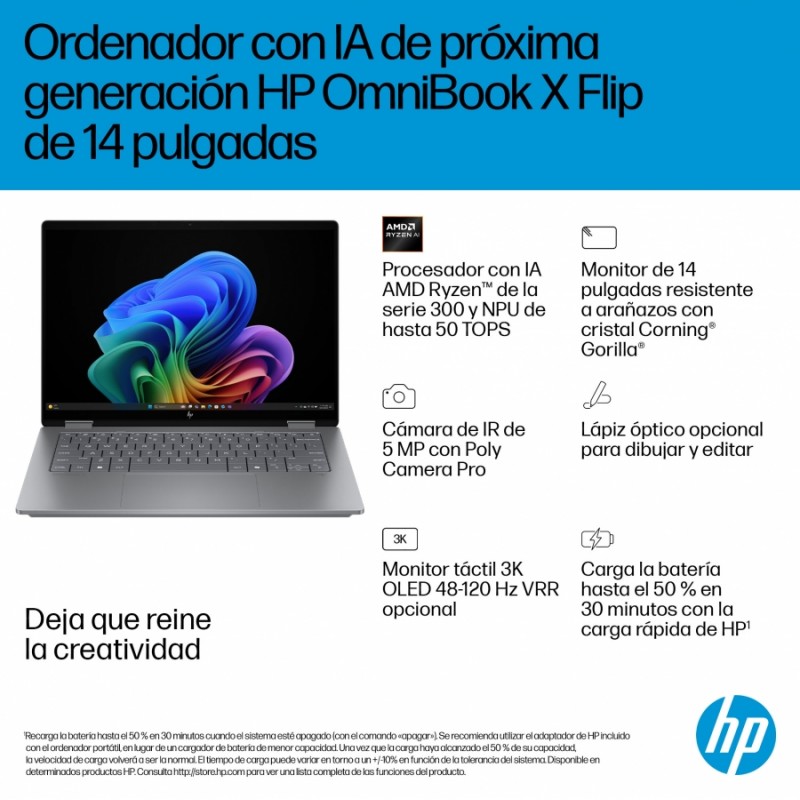 Deja que reine la creatividad con el ordenador HP OmniBook X Flip 14 con IA de próxima generación. Con 4 modos versátiles, este compacto y ligero ordenador con IA de próxima generación te permitirá trabajar y jugar desde cualquier lugar y ángulo. La potencia y la velocidad impulsadas por IA, junto con una batería de carga rápida para todo el día, te mantienen en marcha. El monitor táctil de 14 pulgadas de lado a lado brinda la mejor visión posible.