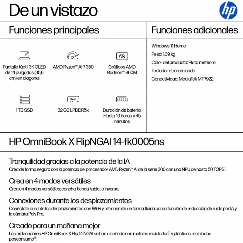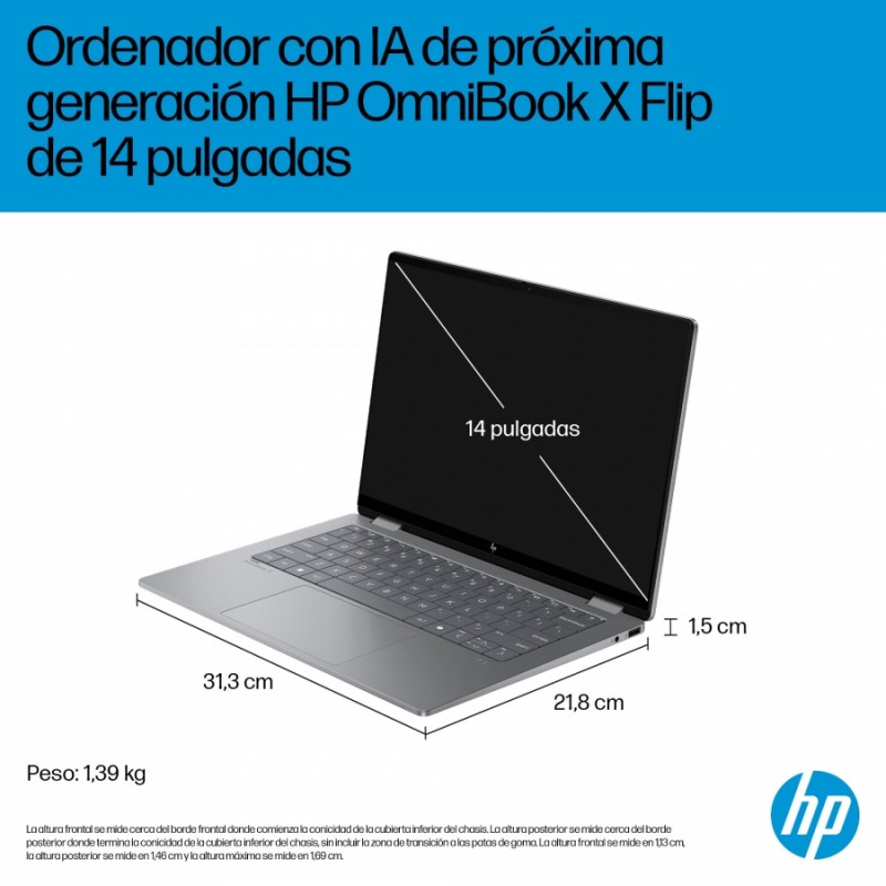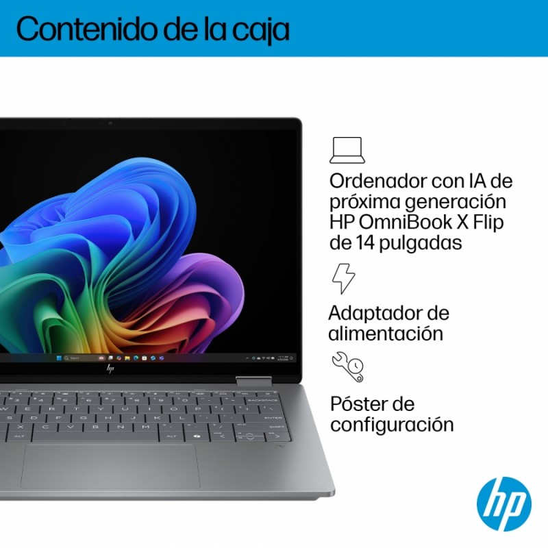 Deja que reine la creatividad con el ordenador HP OmniBook X Flip 14 con IA de próxima generación. Con 4 modos versátiles, este compacto y ligero ordenador con IA de próxima generación te permitirá trabajar y jugar desde cualquier lugar y ángulo. La potencia y la velocidad impulsadas por IA, junto con una batería de carga rápida para todo el día, te mantienen en marcha. El monitor táctil de 14 pulgadas de lado a lado brinda la mejor visión posible.