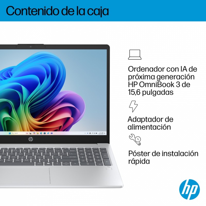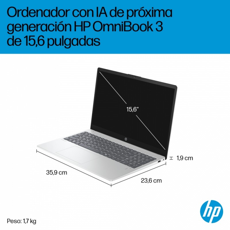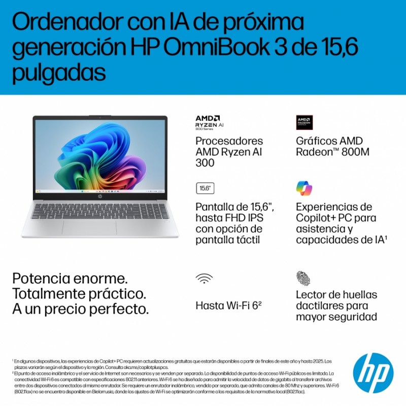 El ordenador con IA de próxima generación HP OmniBook 3 de 15,6 pulgadas ofrece un rápido rendimiento con el procesador AMD Ryzen™ IA[1], un monitor Full HD[2] y una batería que dura todo el día. Permanece conectado con la cámara HP True Vision y disfruta de una portabilidad ligera, mucho espacio de almacenamiento y conectividad USB-C, perfecta para el trabajo, la escuela y el ocio en cualquier lugar.
