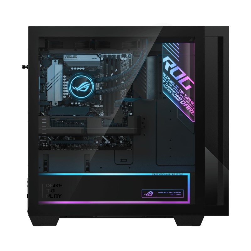 El ROG G700 está totalmente equipado para ser la estación de batalla perfecta para cualquier jugador. Con una capacidad de 58L, el G700 puede acomodar fácilmente GPU de triple ranura, lo que lo hace compatible plug and play con las tarjetas gráficas más potentes, incluida la NVIDIA® GPU GeForce RTX™. Una fuente de alimentación de tamaño completo de 1000 W puede impulsar la última versión de Intel® Procesadores Core™ Ultra, una tarjeta gráfica de tu elección y cualquier periférico que tengas sin sudar. Y con un amplio espacio para cuatro ventiladores de caja incluidos y soportes adicionales para radiadores, el chasis del G700 ofrece un rendimiento de enfriamiento excepcional incluso cuando se combina con hardware de alto rendimiento.