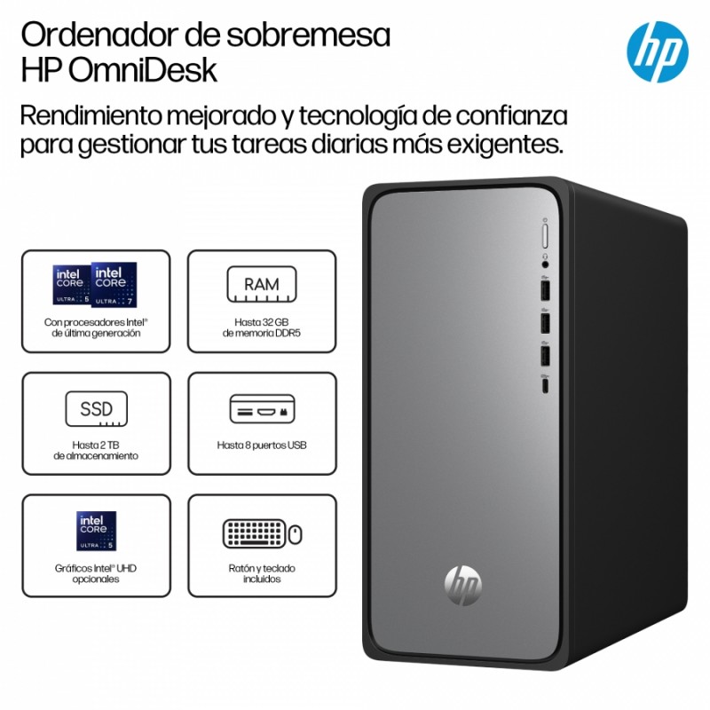 El ordenador HP OmniDesk combina tecnología de confianza con un rendimiento mejorado en un diseño moderno. Maximiza fácilmente la productividad en tu ordenador personal con los puertos más recientes, un procesador Intel[1] rápido y con gran capacidad de respuesta, una fiable tecnología Wi-Fi y una memoria DDR5 para tiempos de arranque rápidos y una multitarea sencilla.