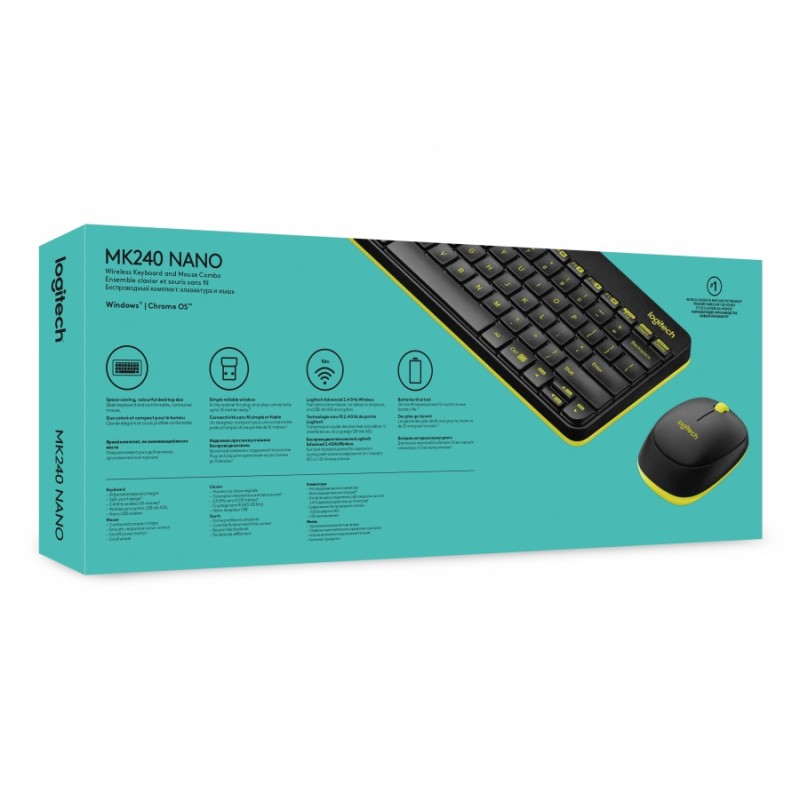Logitech MK240 Nano. Formato del teclado: Estándar, Estilo de teclado: Derecho, Tecnología de conectividad: Inalámbrico, Interfaz del dispositivo: RF inalámbrico, Diseño de teclado: QWERTY, Uso recomendado: Hogar. Color del producto: Negro, Amarillo. Ratón incluido